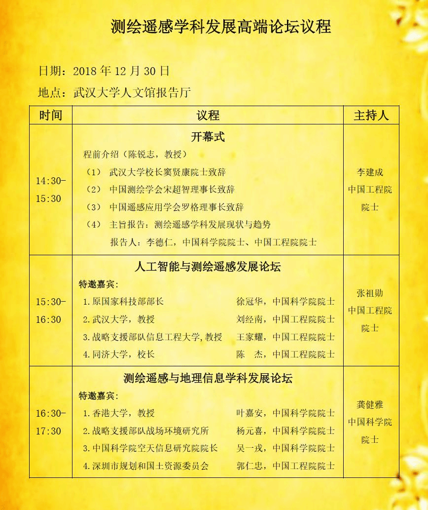 为更好地落实党的十九大精神和我国高校“双一流”建设要求,加快发展我国测绘遥感学科,由武汉大学主办的测绘遥感学科发展高端论坛将于2018年12月30日在中国武汉召开。届时全国测绘遥感领域相关高等院校、科研院所、企事业单位的院士专家将出席本次论坛。