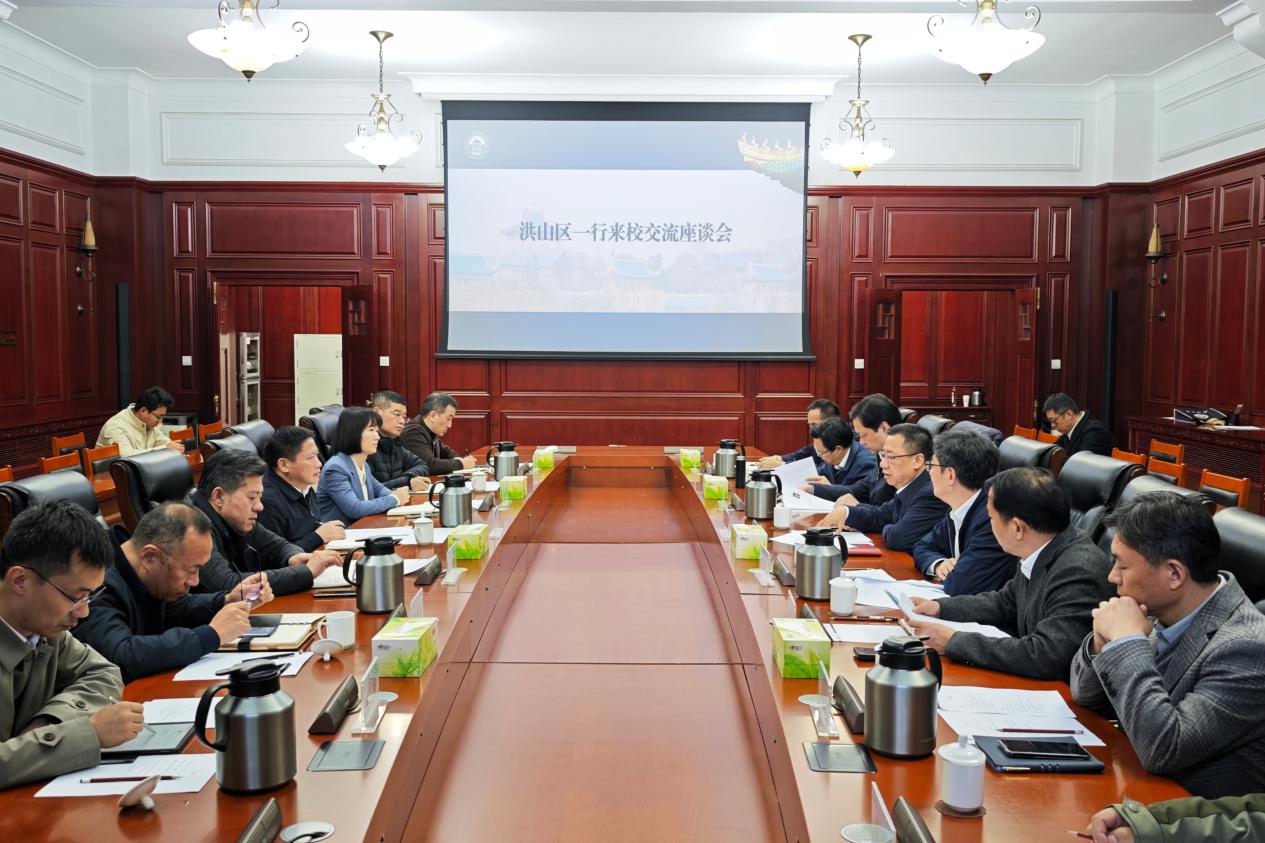 新闻网讯(记者相茹)为深化区校合作,共促高质量发展,11月18日,武汉市洪山区委书记严中兴、区长刘华珍一行来校,校党委书记朱孔军,副校长朱德友、龚威,校长助理、党政办公室主任徐东兴出席座谈会。朱